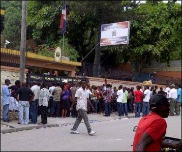 Il est trois heures de l’après midi, des dizaines de compatriotes haïtiens se sont rassemblé devant le consulat général de la République dominicaine, à Pétion-Ville. Les rayons du soleil se sont heureusement atténués en ce lundi 19 août par un temps nuageux qui annonce la pluie. Dans une longue file mal formée, sur le trottoir de la rue Panaméricaine, ces demandeurs de visa se bousculent les uns les autres comme devant les bureaux haïtiens de service public.